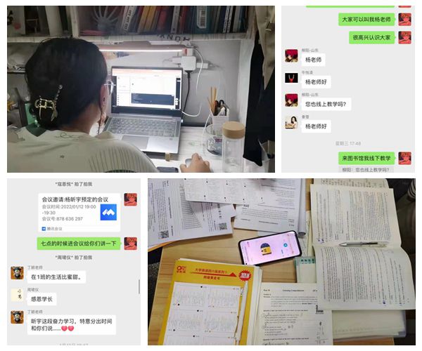 高质量学习的同时,大学生创新创业大赛、校园征文等实践活动也全面转入线上。同学们线上收集信息,选取主题,组建团队,更好地利用互联网资源,有序推进各项活动。“一帮一”学习小组在“线上学习”中发挥重要作用,同学通过群聊学习打卡、会议交流等方式进行互助学习。“现阶段我们注重的问题是基础,我会定期帮我的帮扶对象制定学习计划,通过微信检查完成进度和效果,然后制定下一步的计划。”英语203班的李文一说道。