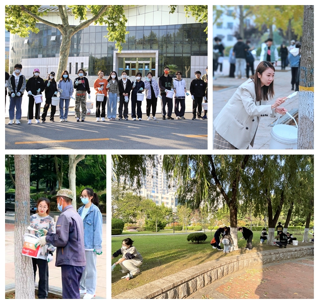 在学院为每班特殊聘请的生服工作人员的耐心指导下,同学们怀着高涨的热情投入到树木“涂白”工作中,端盆、刷漆、清洗,大家各司其职,干得热火朝天,熟练掌握了刷漆相关技巧的同时,同学们跟老师积极讨论给树木刷白的更具有经济性的方法,活动现场一片繁忙热闹的景象。