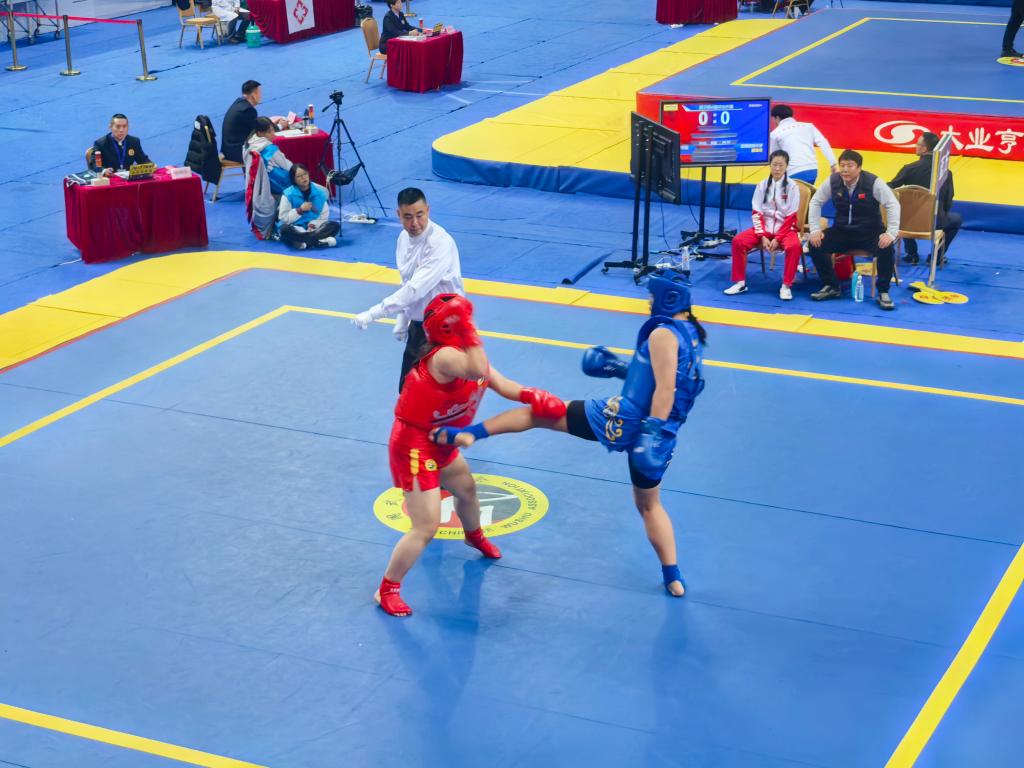 散打训练难免遭遇瓶颈期,每当有队员技术停滞不前时,队友们总会主动牺牲课余时间加训陪练,一起琢磨动作要领,共同攻克难点。对抗训练中,鼻子出血、嘴角擦伤是常事。新队员面对技术更精湛的老队员,就凭着“不怕打、敢进攻”的气势奋力拼搏。有时女队员搭档男队员对练,因为力量悬殊总是被打哭,可她们从不抱怨,擦干眼泪就回到赛场。这种“亦敌亦友”的情谊,也让团队凝聚力愈发浓厚。训练前,队员们会主动收拾场馆、摆放器材、烧好热水,默契得如同家人;训练后,大家也会围坐在一起相互按摩放松,分享训练心得。