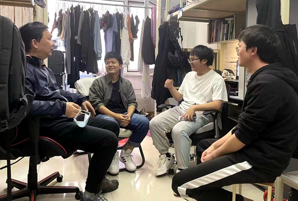 ▲侯兆铭深入寝室倾听同学们的心声。