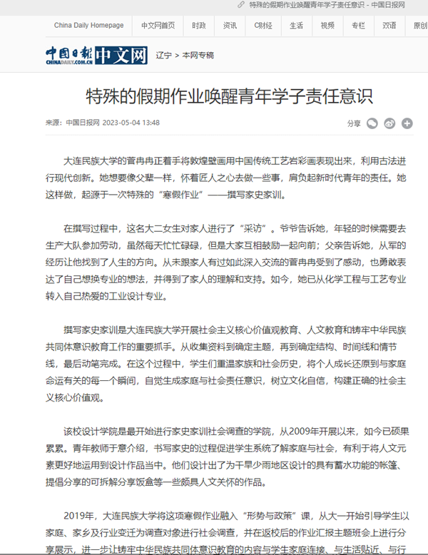 该校设计学院是最开始进行家史家训社会调查的学院,从2009年开展以来,如今已硕果累累。青年教师于意介绍,书写家史的过程促进学生系统了解家庭与社会,有利于将人文元素更好地运用到设计作品当中。他们设计出了为干旱少雨地区设计的具有蓄水功能的帐篷、提倡分享的可拆解分享饭盒等一些颇具人文关怀的作品。