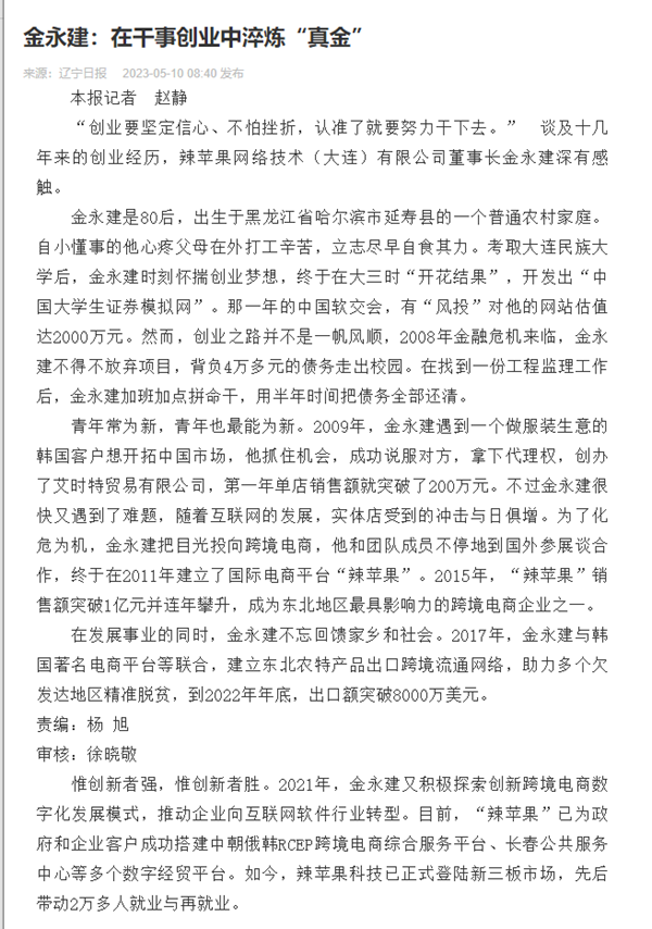 惟创新者强,惟创新者胜。2021年,金永建又积极探索创新跨境电商数字化发展模式,推动企业向互联网软件行业转型。目前,“辣苹果”已为政府和企业客户成功搭建中朝俄韩RCEP跨境电商综合服务平台、长春公共服务中心等多个数字经贸平台。如今,辣苹果科技已正式登陆新三板市场,先后带动2万多人就业与再就业。