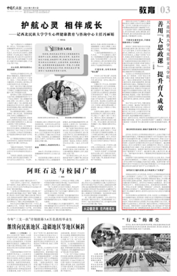 深挖各门课程所蕴含的中华民族共同体意识教育元素,重点突出“五观”“五个认同”教育,引导学生牢固树立休戚与共、荣辱与共、生死与共、命运与共的共同体理念,以增进“共同性”为方向,构建全课程专题教学内容体系。2020年,体现学校思政课教学改革成果的“民族院校思想政治理论课铸牢中华民族共同体意识的探索与实践”获得辽宁省教学成果奖二等奖。2022年,“中华民族共同体意识教育融入高校思政课教学研究”获批教育部高校思想政治理论课教师研究专项课题立项。