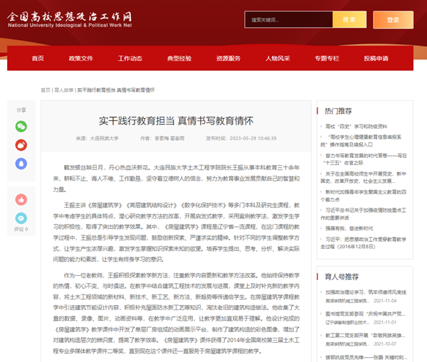 “在育人中提出‘钢筋混凝土精神’,培养学生敢于负责、勇挑重担的担当精神;甘于奉献、团结协作的团队精神;不屈不挠、自强不息的民族精神。”王振介绍,通过践行钢筋混凝土精神,激励、培养学生养成优秀品格。在日常教学工作中重视德育培养,帮助学生树立正确的价值观念。对待学生认真负责,从书本上的难题到生活里的不如意,王振都会尽心尽力去帮助解决。对待个人严于律己,始终秉持终身学习的观念不断提升自己。重视美育发展,重视思想提升,始终坚持将社会主义核心价值观贯穿在教学的各个环节,培养学生德智体美劳全面发展。积极开展教学改革工作,成果曾先后获得省级教学成果奖6项。