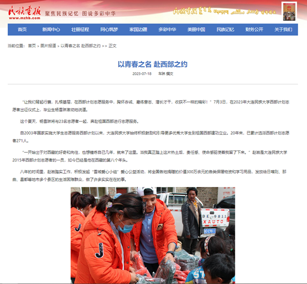 如今,越来越多的大连民大学子报名参加西部计划,他们跨地区做志愿服务,异地交流当使者,成为有形有感有效地在志愿服务工作中铸牢中华民族共同体意识的生动践行者。
