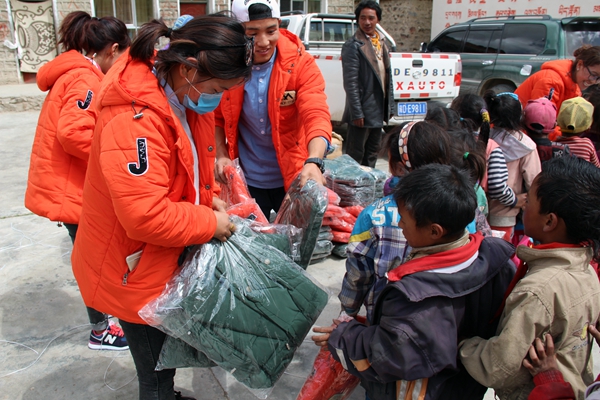 赵岩和志愿者们在拉萨市城关区娘热乡发放爱心物资。