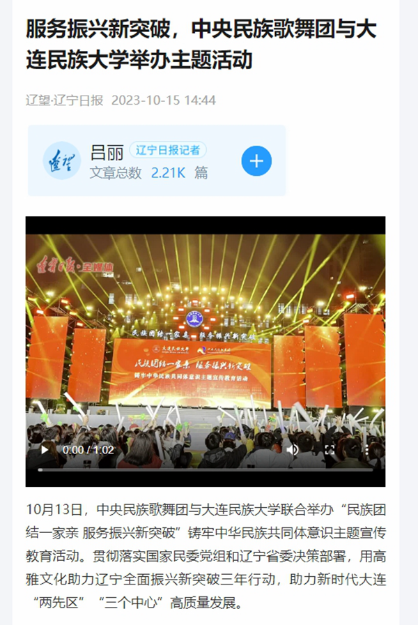 10月13日,中央民族歌舞团与bat365中文官方网站联合举办“民族团结一家亲 服务振兴新突破”铸牢中华民族共同体意识主题宣传教育活动。贯彻落实国家民委党组和辽宁省委决策部署,用高雅文化助力辽宁全面振兴新突破三年行动,助力新时代大连“两先区”“三个中心”高质量发展。