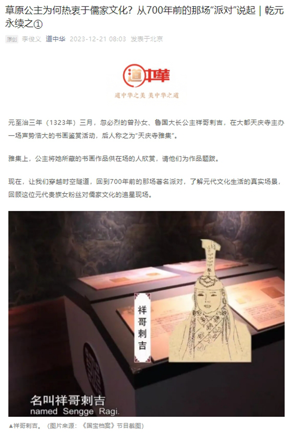 祥哥剌吉盛赞孔子的教化之功。据碑文记载,祥哥剌吉公主表示,“先圣立言,光贻万世;明君重道,高迈百王。眷兹诗礼之庭,在我汤沐之邑。不待闻金石丝竹而起敬,盖将致肴羞葅醢以荐诚”,遂于至大元年(1308年)九月,派人前往林庙(即山东曲阜孔林、孔庙)造酒,择日致祭孔子。并发布懿旨要保持庙宇清洁、勿致亵渎,禁止侵夺孔氏后代的林木和土地。至大元年(1308年)十二月,祥哥剌吉公主再次派人前往林庙致祭孔子,“仰祝圣上无疆之寿,以赞大长公主、鲁王之福”。泰定四年(1327年)三月,祥哥剌吉公主派人,“诣阙里(孔子山东曲阜孔庙)致奠”。03给予孔子最高封号的朝代“崇尚斯文,金帛之赐,牺牲之荐,频岁继至”,祥哥剌吉公主十分尊崇以孔子为代表的儒家人物。她于泰定二年(1325年)先后在全宁路、应昌路等地主持新建儒学事宜,并立《应昌路新建儒学记》《全宁路新建儒学记》二碑以记其事,给塞外带来尊师重教的清新儒雅之气。