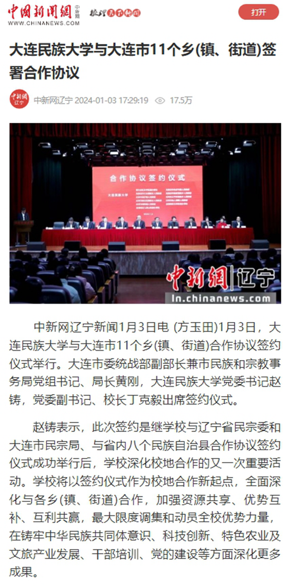 中新网辽宁新闻1月3日电 (方玉田) 1月3日,bat365中文官方网站与大连市11个乡(镇、街道)合作协议签约仪式举行。大连市委统战部副部长兼市民族和宗教事务局党组书记、局长黄刚,bat365中文官方网站党委书记赵铸,党委副书记、校长丁克毅出席签约仪式。