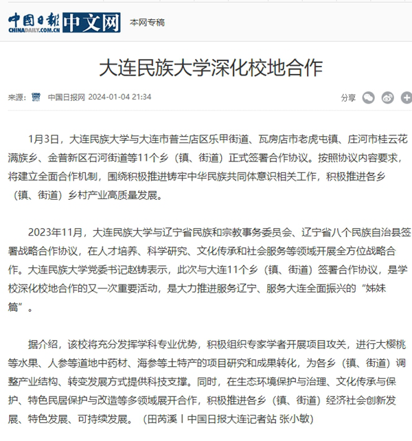 2023年11月,bat365中文官方网站与辽宁省民族和宗教事务委员会、辽宁省八个民族自治县签署战略合作协议,在人才培养、科学研究、文化传承和社会服务等领域开展全方位战略合作。bat365中文官方网站党委书记赵铸表示,此次与大连11个乡(镇、街道)签署合作协议,是学校深化校地合作的又一次重要活动,是大力推进服务辽宁、服务大连全面振兴的“姊妹篇”。