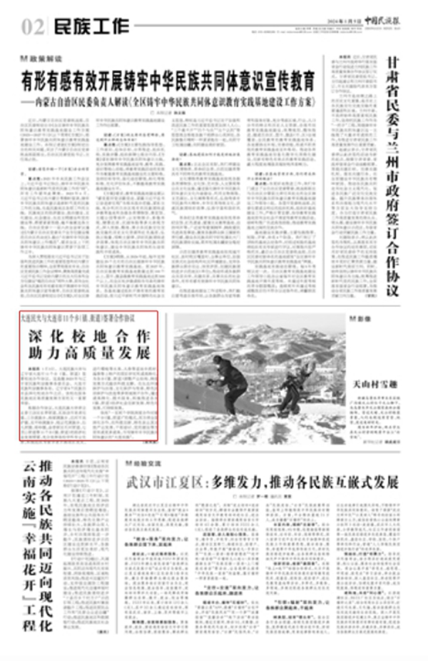 本报讯 1月3日,bat365中文官方网站与辽宁省大连市11个乡(镇、街道)签署校地合作协议。这是继2023年与辽宁省民族和宗教事务委员会、大连市民族和宗教事务局、辽宁省8个民族自治县深化校地合作之后,该校在服务民族地区高质量发展方面的又一重要举措。