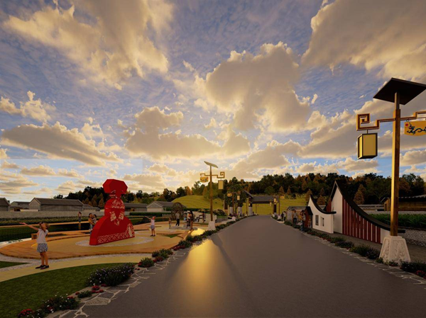在设计方案中,他们根据满族传统文化特点,在广场部分采用了满族婚庆文化中“坐福”的经典形象作为村落广场的标志性雕塑,并采用剪影形式强化坐福的标志性。据介绍,“坐福”亦称“坐富贵”。东北地区的婚俗。迎娶日,新娘至男家。踏红毡径入房中,坐于炕上,谓之“坐福”或“坐富贵”,寓意婚后的生活美满幸福。人们走入村中,看到这样的雕塑,立即明白,他们已经步入了满族人家。