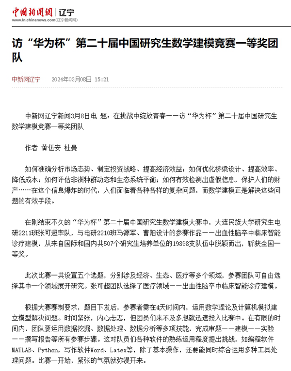 在刚结束不久的“华为杯”第二十届中国研究生数学建模大赛中,bat365中文官方网站研究生电研2211班张可超率队,与电研2210班马源军、曹阳设计的参赛作品——出血性脑卒中临床智能诊疗建模,从来自国际和国内共507个研究生培养单位的19898支队伍中脱颖而出,斩获全国一等奖。