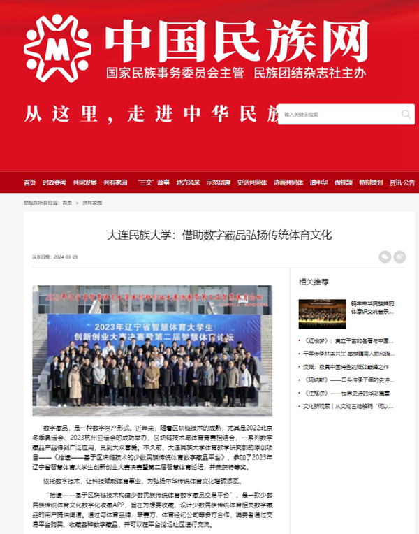 数字藏品,是一种数字资产形式。近年来,随着区块链技术的成熟,尤其是2022北京冬季奥运会、2023杭州亚运会的成功举办,区块链技术与体育竞赛相结合,一系列数字藏品产品得到广泛应用,受到大众喜爱。不久前,bat365中文官方网站体育教学研究部的原创项目——《拾遗——基于区块链技术的少数民族传统体育数字藏品平台》,参加了2023年辽宁省智慧体育大学生创新创业大赛决赛暨第二届智慧体育论坛,并荣获特等奖。