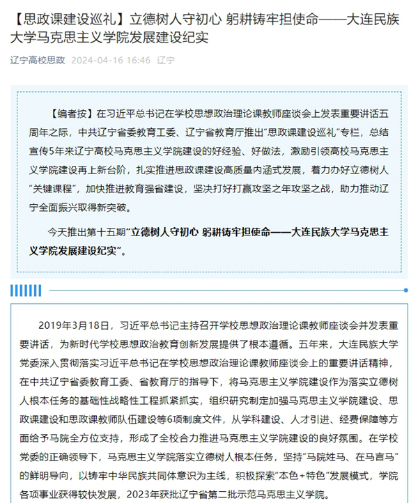 【编者按】在习近平总书记在学校思想政治理论课教师座谈会上发表重要讲话五周年之际,中共辽宁省委教育工委、辽宁省教育厅推出“思政课建设巡礼”专栏,总结宣传5年来辽宁高校马克思主义学院建设的好经验、好做法,激励引领高校马克思主义学院建设再上新台阶,扎实推进思政课建设高质量内涵式发展,着力办好立德树人“关键课程”,加快推进教育强省建设,坚决打好打赢攻坚之年攻坚之战,助力推动辽宁全面振兴取得新突破。
