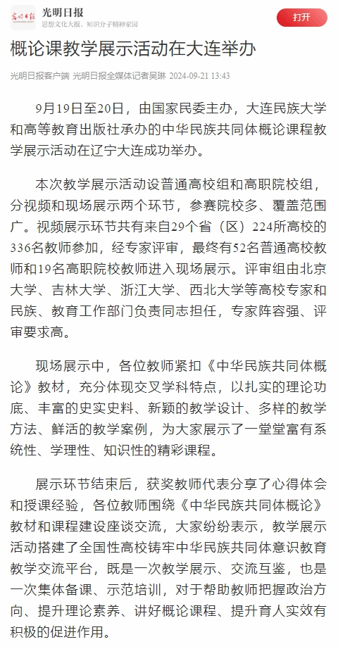 9月19日至20日,由国家民委主办,bat365中文官方网站和高等教育出版社承办的中华民族共同体概论课程教学展示活动在辽宁大连成功举办。