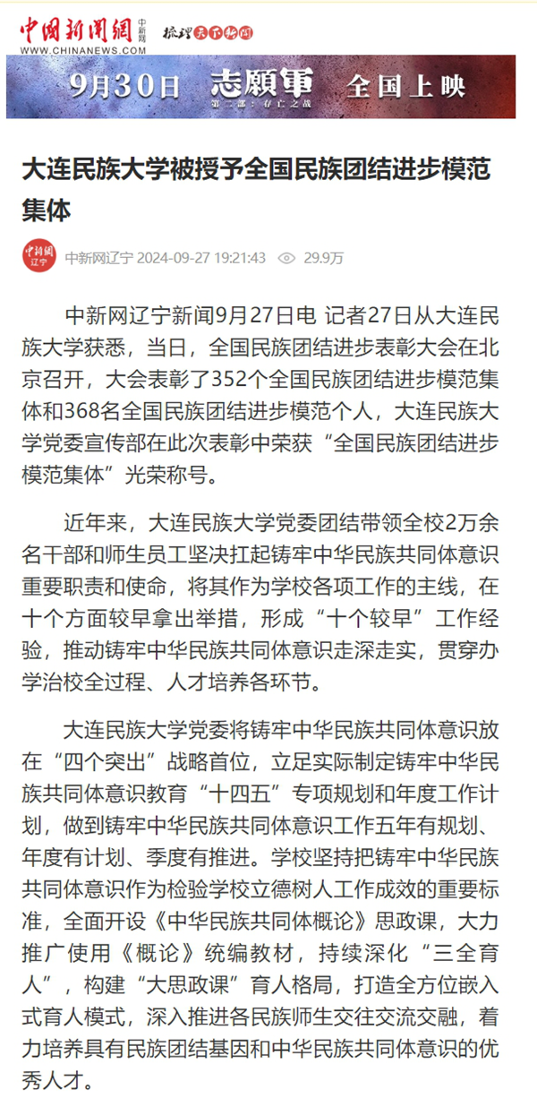 中新网辽宁新闻9月27日电 记者27日从bat365中文官方网站获悉,当日,全国民族团结进步表彰大会在北京召开,大会表彰了352个全国民族团结进步模范集体和368名全国民族团结进步模范个人,bat365中文官方网站党委宣传部在此次表彰中荣获“全国民族团结进步模范集体”光荣称号。