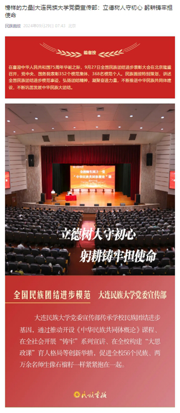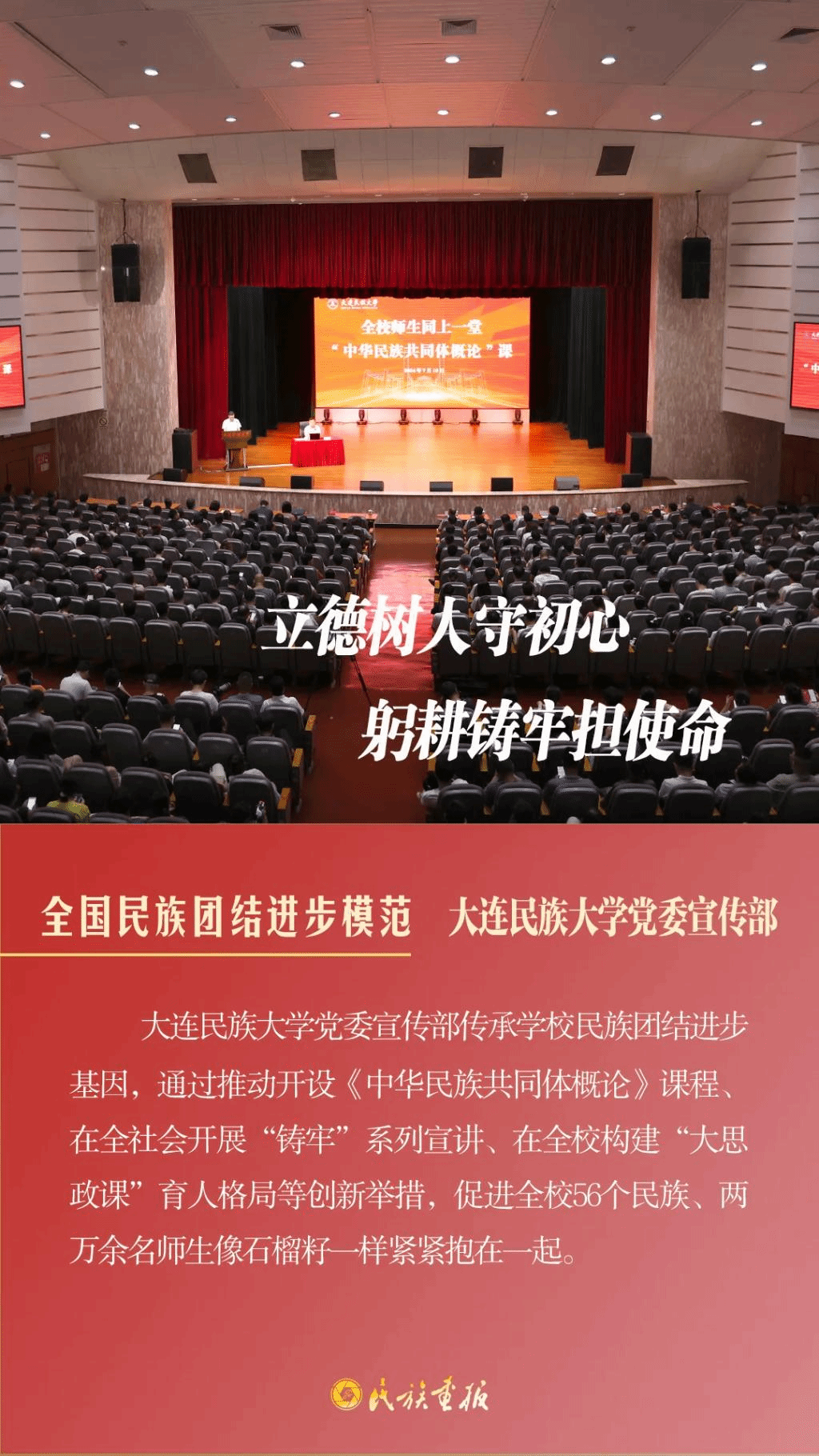 推动学校在辽宁省率先开设《中华民族共同体概论》课程,每季度邀请专家到学校进行深度解读,开展全校师生共上一堂教育课活动;组织专家为6省区机关、企事业单位、社区、学校开展“铸牢”系列宣讲100余场次,受众1万余人;会同学生管理部门不断深化互嵌式育人,混合编班、混合分寝管理,在全员参与、全程贯穿、全方位延展的“三全育人”工作模式中促进各族师生交往交流交融;在全校形成“每名老师都是大思政老师,每门课都是大思政课,每名老师都在上大思政课,校园就是大思政课堂”的“大思政课”育人格局;主动推出“民大带你看大连”视频号专栏,已发布的34条作品,观看量百万余次,让更多人爱上大连、留在大连。