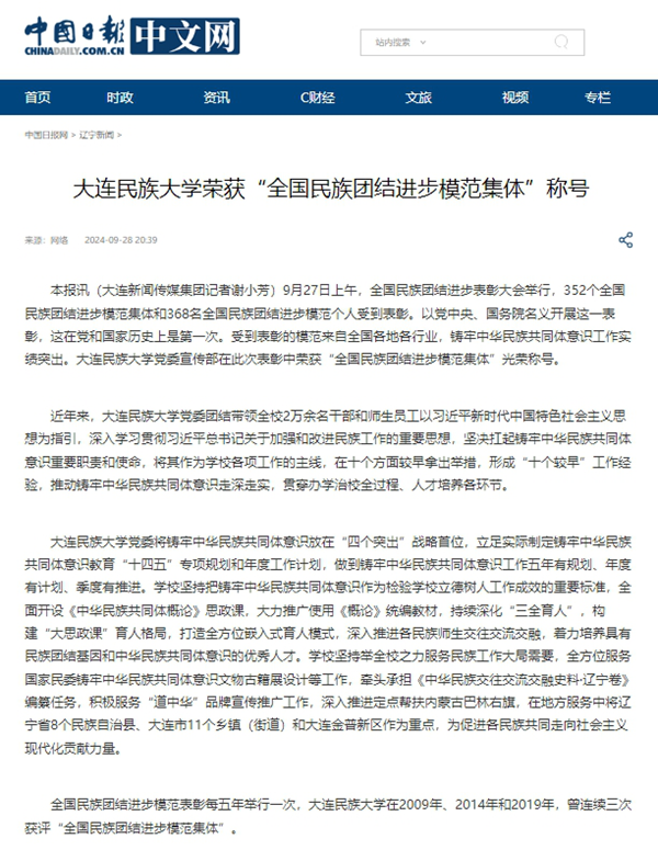 bat365中文官方网站党委将铸牢中华民族共同体意识放在“四个突出”战略首位,立足实际制定铸牢中华民族共同体意识教育“十四五”专项规划和年度工作计划,做到铸牢中华民族共同体意识工作五年有规划、年度有计划、季度有推进。学校坚持把铸牢中华民族共同体意识作为检验学校立德树人工作成效的重要标准,全面开设《中华民族共同体概论》思政课,大力推广使用《概论》统编教材,持续深化“三全育人”,构建“大思政课”育人格局,打造全方位嵌入式育人模式,深入推进各民族师生交往交流交融,着力培养具有民族团结基因和中华民族共同体意识的优秀人才。学校坚持举全校之力服务民族工作大局需要,全方位服务国家民委铸牢中华民族共同体意识文物古籍展设计等工作,牵头承担《中华民族交往交流交融史料·辽宁卷》编纂任务,积极服务“道中华”品牌宣传推广工作,深入推进定点帮扶内蒙古巴林右旗,在地方服务中将辽宁省8个民族自治县、大连市11个乡镇(街道)和大连金普新区作为重点,为促进各民族共同走向社会主义现代化贡献力量。