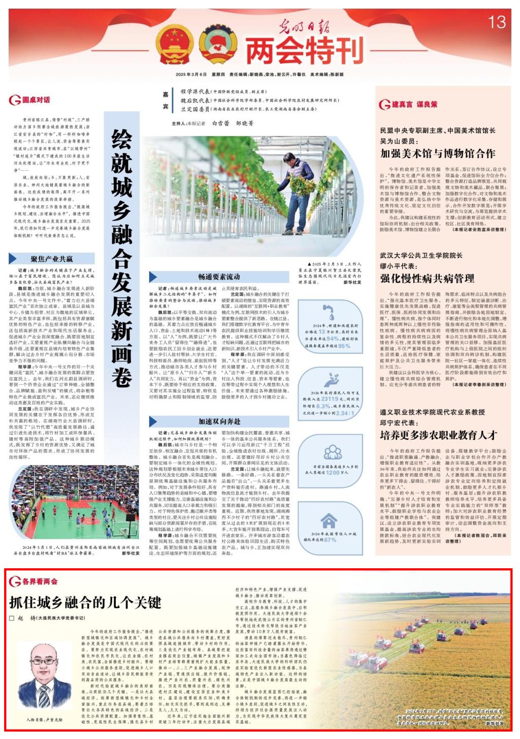 在2025年全国两会胜利召开之际,3月6日,《光明日报》“两会特刊”专题专刊,刊发党委书记赵铸署名文章:抓住城乡融合的几个关键。