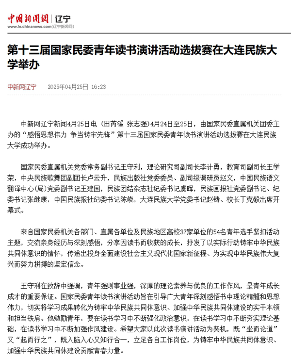中新网辽宁新闻4月25日电 (田芮溪 张志强) 4月24日至25日,由国家民委直属机关团委主办的“感悟思想伟力 争当铸牢先锋”第十三届国家民委青年读书演讲活动选拔赛在bat365中文官方网站成功举办。