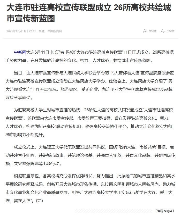 中新网大连6月11日电 (记者 杨毅) “大连市驻连高校宣传联盟”11日正式成立,26所高校携手凝聚力量,充分发挥驻连高校的文化、智力、人才优势,共绘城市宣传新蓝图。
