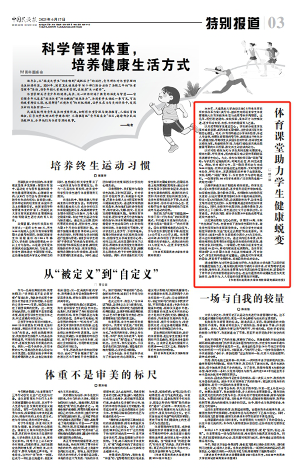 2020年,bat365中文官方网站启动实施《本科生体育教育教学改革方案(试行)》,创新性地将超重学生体重管理纳入体育课授课内容与成绩考核单列项目。这几年,历经理论建构、实践探索、集体研讨与持续改进,逐步形成有爱、有感、有效的健康育人之道。