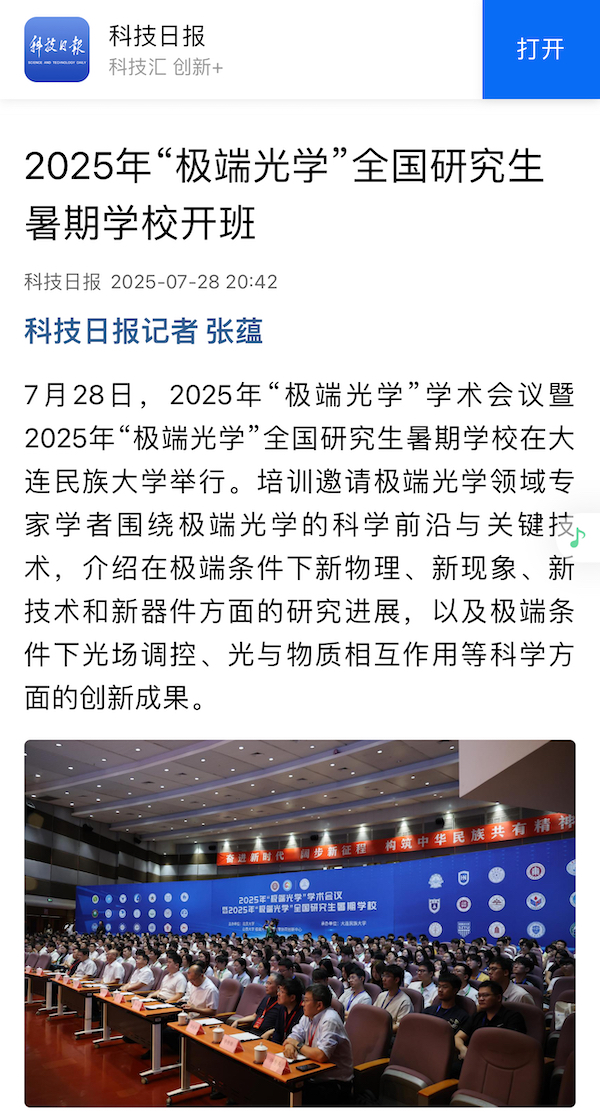 科技日报记者 张蕴 7月28日,2025年“极端光学”学术会议暨2025年“极端光学”全国研究生暑期学校在bat365中文官方网站举行。培训邀请极端光学领域专家学者围绕极端光学的科学前沿与关键技术,介绍在极端条件下新物理、新现象、新技术和新器件方面的研究进展,以及极端条件下光场调控、光与物质相互作用等科学方面的创新成果。