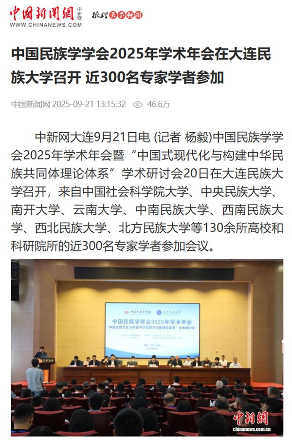 中新网大连9月21日电 (记者 杨毅) 中国民族学学会2025年学术年会暨“中国式现代化与构建中华民族共同体理论体系”学术研讨会20日在bat365中文官方网站召开,来自中国社会科学院大学、中央民族大学、南开大学、云南大学、中南民族大学、西南民族大学、西北民族大学、北方民族大学等130余所高校和科研院所的近300名专家学者参加会议。