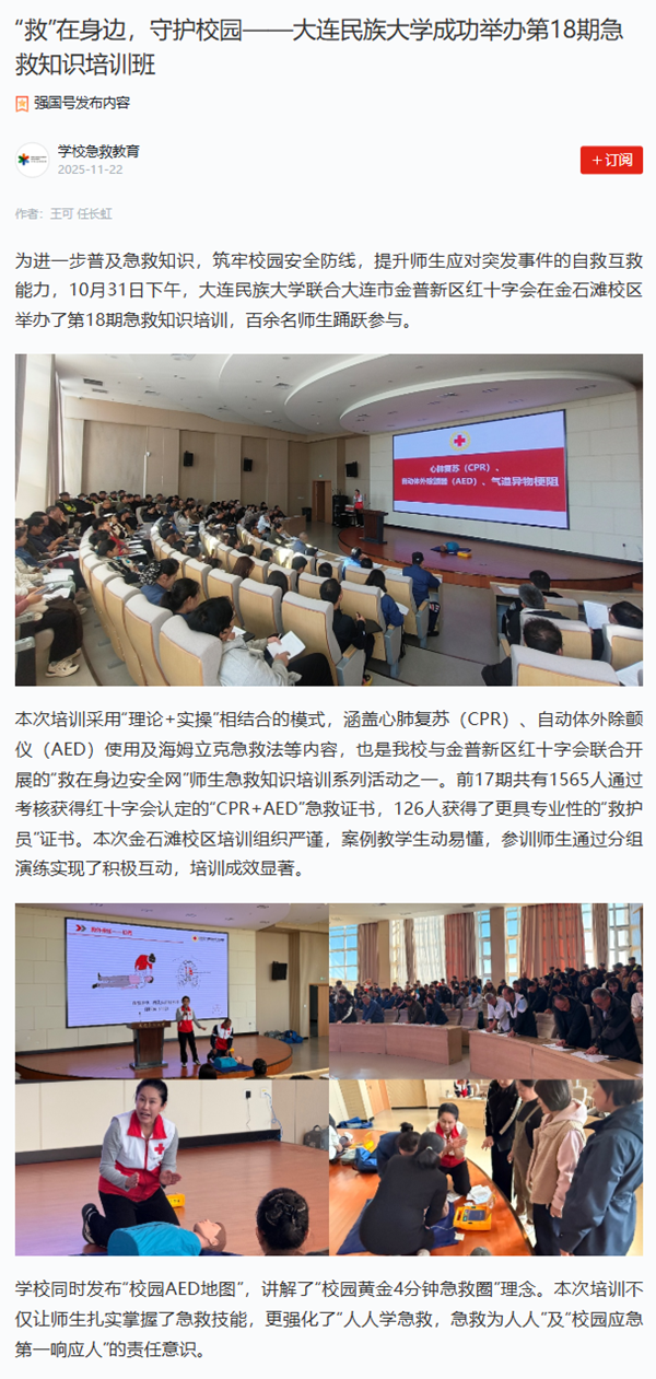 作为第二批全国学校急救教育试点学校,学校将依托金普新区红十字会持续推进急救知识普及与技能培训,切实发挥示范引领作用,构建更加和谐友爱、充满奉献精神的平安校园。