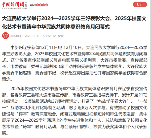 2025年校园文化艺术节暨铸牢中华民族共同体意识教育月在辽宁省委宣传部、省委教育工委和大连市委宣传部、市委教育工委指导支持下,累计开展21项校级活动、15项院级活动和37项社团活动,打造了“各族学子看大连”、“一帮一”互助学习小组评比等特色活动,吸引近8万人次参与,有效推动了校园文化建设与“铸牢”教育深度融合。闭幕式现场通过视频短片和师生代表发言,集中展示了2024—2025学年涌现出的学生先进集体和个人,总结和表彰了校园文化艺术节暨“铸牢”教育月活动。与会领导和教师、校友为获奖集体和个人代表颁奖。