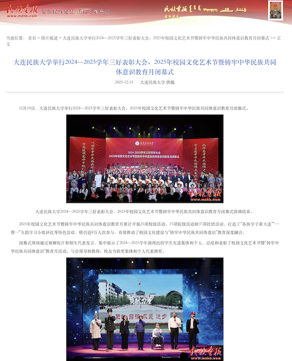 2025年校园文化艺术节暨铸牢中华民族共同体意识教育月累计开展21项校级活动、15项院级活动和37项社团活动,打造了“各族学子看大连”“一帮一”互助学习小组评比等特色活动,吸引近8万人次参与,有效推动了校园文化建设与“铸牢中华民族共同体意识”教育深度融合。