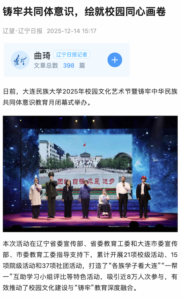 本次活动在辽宁省委宣传部、省委教育工委和大连市委宣传部、市委教育工委指导支持下,累计开展21项校级活动、15项院级活动和37项社团活动,打造了“各族学子看大连”“一帮一”互助学习小组评比等特色活动,吸引近8万人次参与,有效推动了校园文化建设与“铸牢”教育深度融合。