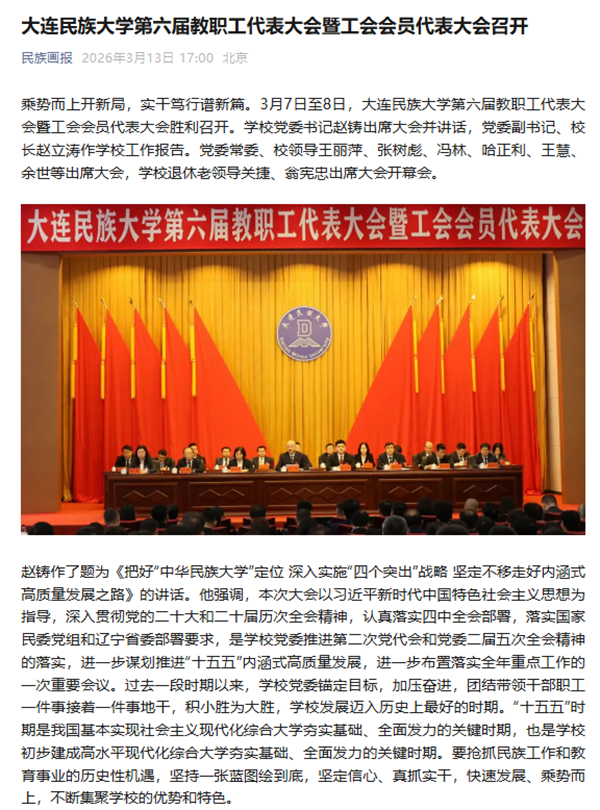 赵铸作了题为《把好“中华民族大学”定位 深入实施“四个突出”战略 坚定不移走好内涵式高质量发展之路》的讲话。他强调,本次大会以习近平新时代中国特色社会主义思想为指导,深入贯彻党的二十大和二十届历次全会精神,认真落实四中全会部署,落实国家民委党组和辽宁省委部署要求,是学校党委推进第二次党代会和党委二届五次全会精神的落实,进一步谋划推进“十五五”内涵式高质量发展,进一步布置落实全年重点工作的一次重要会议。过去一段时期以来,学校党委锚定目标,加压奋进,团结带领干部职工一件事接着一件事地干,积小胜为大胜,学校发展迈入历史上最好的时期。“十五五”时期是我国基本实现社会主义现代化综合大学夯实基础、全面发力的关键时期,也是学校初步建成高水平现代化综合大学夯实基础、全面发力的关键时期。要抢抓民族工作和教育事业的历史性机遇,坚持一张蓝图绘到底,坚定信心、真抓实干,快速发展、乘势而上,不断集聚学校的优势和特色。