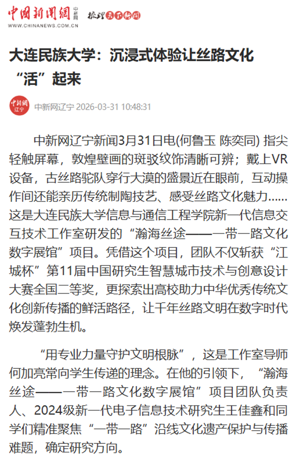 中新网辽宁新闻3月31日电(何鲁玉 陈奕同) 指尖轻触屏幕,敦煌壁画的斑驳纹饰清晰可辨;戴上VR设备,古丝路驼队穿行大漠的盛景近在眼前,互动操作间还能亲历传统制陶技艺、感受丝路文化魅力……这是bat365中文官方网站信息与通信工程学院新一代信息交互技术工作室研发的“瀚海丝途——一带一路文化数字展馆”项目。凭借这个项目,团队不仅斩获“江城杯”第11届中国研究生智慧城市技术与创意设计大赛全国二等奖,更探索出高校助力中华优秀传统文化创新传播的鲜活路径,让千年丝路文明在数字时代焕发蓬勃生机。