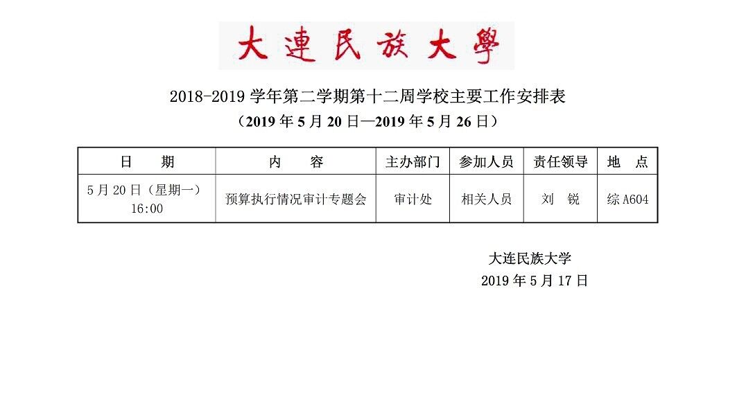 2018-2019学年第二学期第十二周学校主要工作安排表