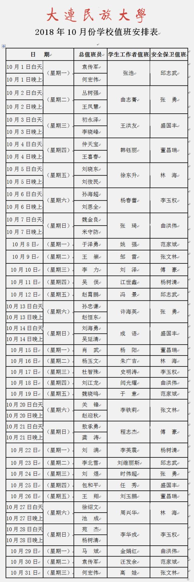 2018年10月份学校值班安排表