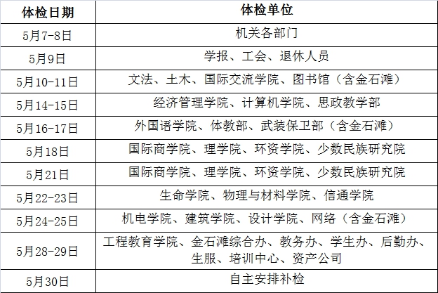 2、大连体检中心检查时间:5月7日-5月29日(每天上午7:40—9:30),各单位体检日期安排见附表。
