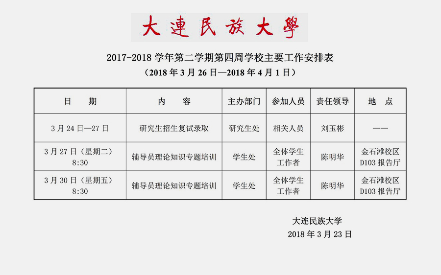 2017-2018学年第二学期第四周学校主要工作安排表