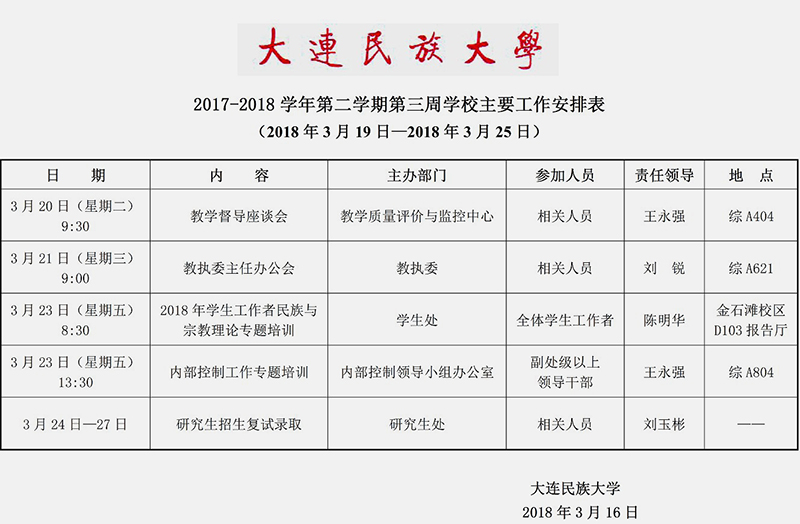 2017-2018学年第二学期第三周学校主要工作安排表