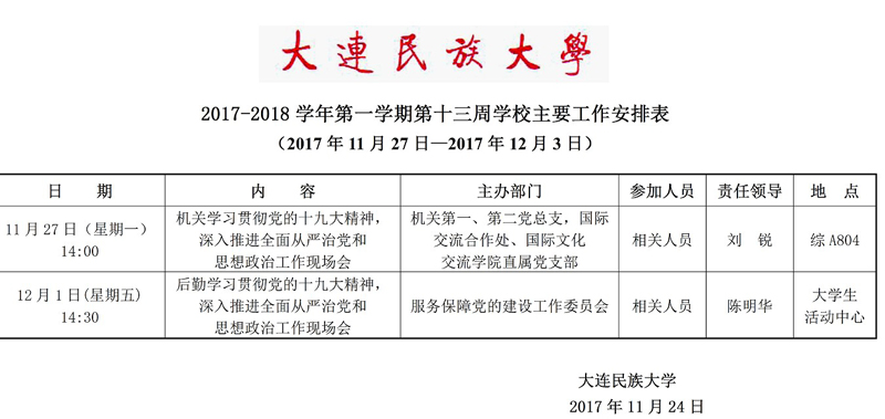 2017-2018学年第一学期第十三周学校主要工作安排表