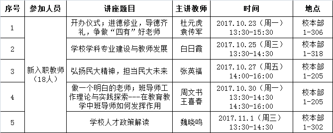 按照学校要求从2017年10月23日开始,举办新入职教师(名单附后)岗前培训班。现将相关事宜通知如下: