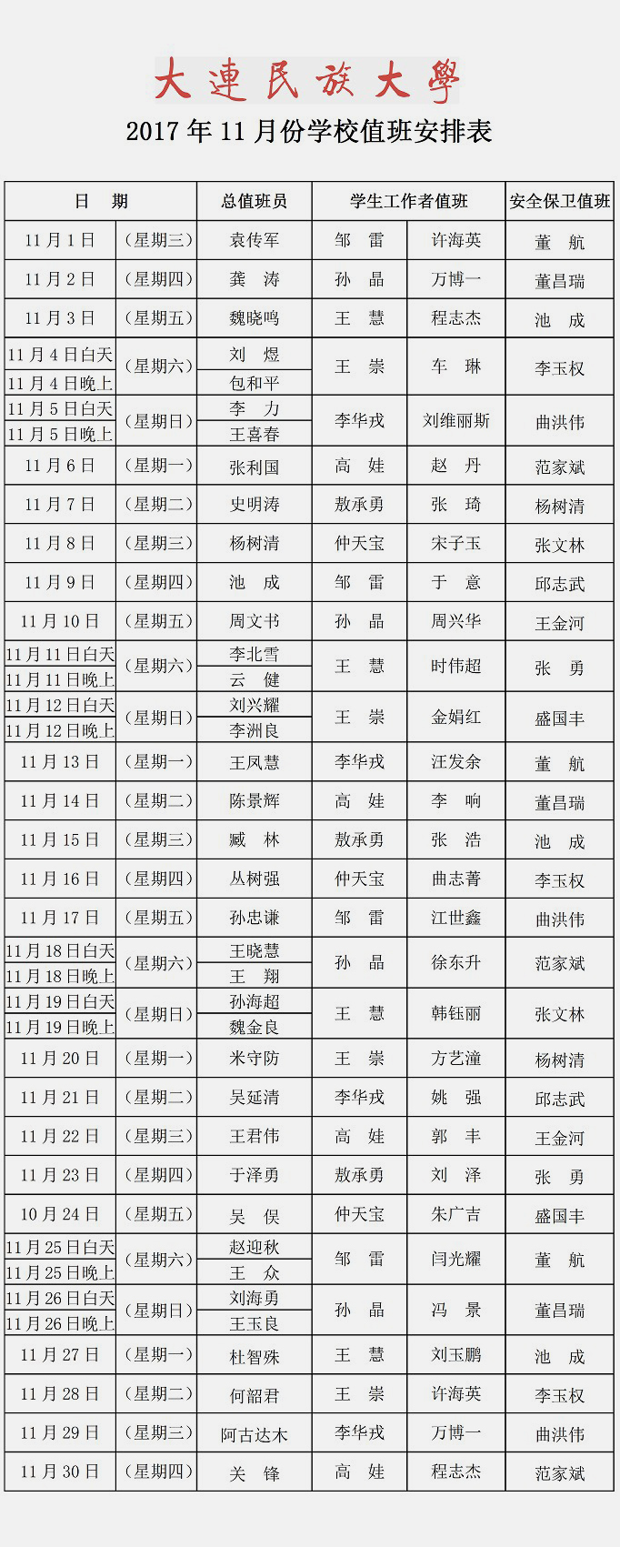 2017年11月份学校值班安排表