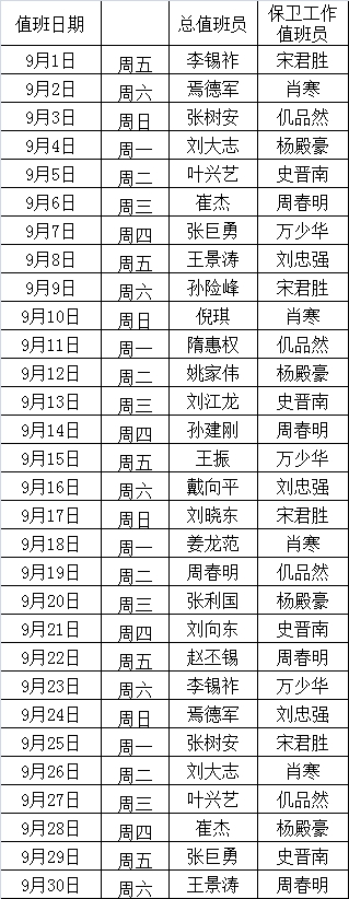 金石滩校区2017年9月份值班表