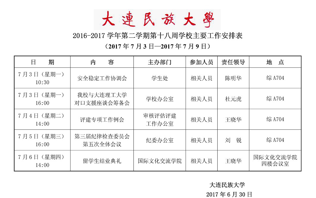 2016-2017学年第二学期第十八周学校主要工作安排表