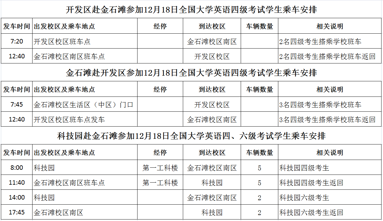 考试当日全面封闭开发区校区第一教学楼、第二教学楼、综合楼,金石滩校区主楼、第一实验楼和经管楼,金石滩校区北区第一工科楼(西区),考试无关人员严禁入内。