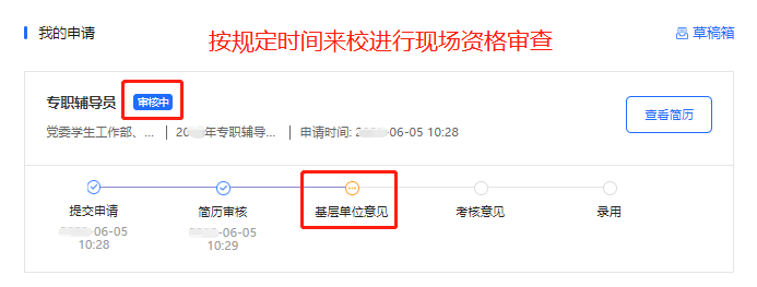 请应聘人员登录学校人才招聘网http://zp.dlnu.edu.cn,点击“我的申请”,如系统显示“审核中”且流程在“基层单位意见”的人员按规定时间来校进行现场资格审查。如图示: