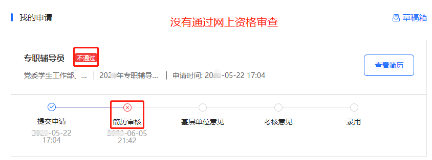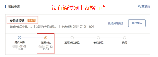 如系统在“简历审核”环节显示“已退回”或“不通过”即不符合本次报名条件,没有通过网上资格审查,如图示: