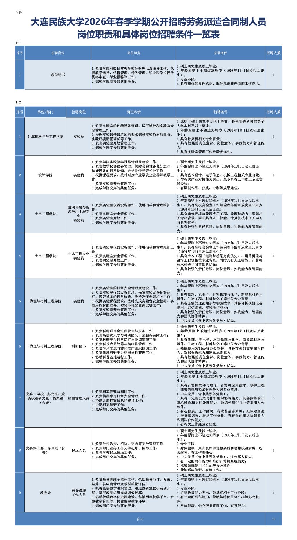 详见《bat365中文官方网站2026年春季学期公开招聘劳务派遣合同制人员岗位职责和具体岗位招聘条件一览表》(附件1)。