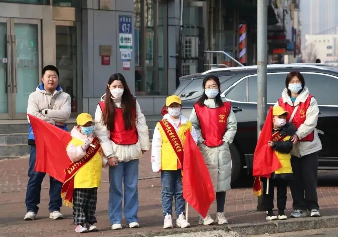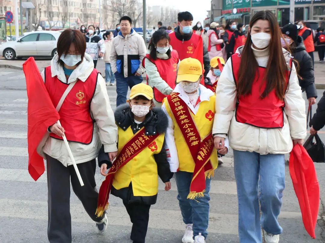 志愿者们来到金源医院前,协助指挥交通,劝导行人依照交通灯指示通行,护送老人穿过马路,维护人行道安全有序。